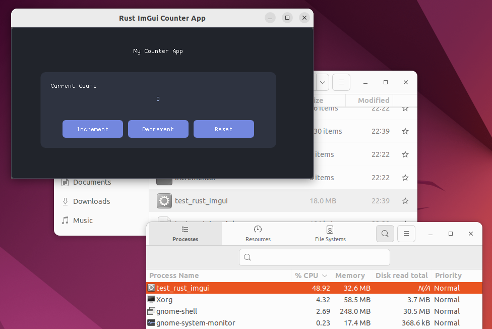 The performance metrics from the task managers reveal this tradeoff—the ImGui application uses more CPU due to constant redrawing. Developers should consider these tradeoffs when choosing between immediate mode libraries like ImGui and traditional retained mode frameworks for cross-platform desktop applications.